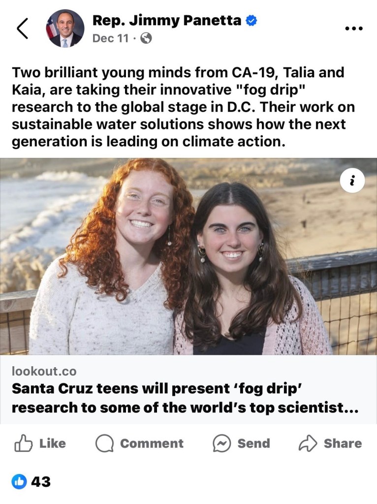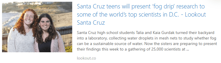 - Santa Cruz teens will present ‘fog drip’ research to some of the world’s top scientists in D.C., Lookout Santa Cruz, December 9, 2024. link to news article.