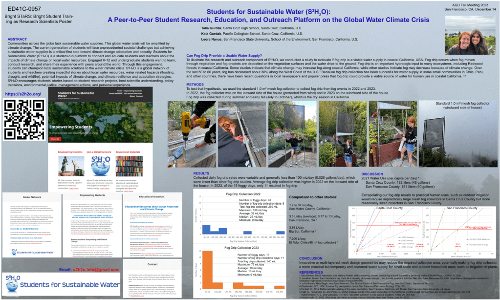 San Francisco, California: AGU Fall Meeting, Bright STaRS: Bright Students Training as Research Scientists posters, S2H2O: A peer-to-peer student research, education, and outreach platform on the global water climate crisis, by Talia Gurdak from Santa Cruz High School and Kaia Gurdak from Pacific Collegiate School, December 14, 2023: story here