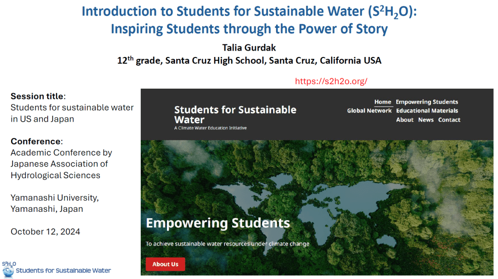 Japanese Association of Hydrological Sciences conference, session on Students for Sustainable Water, Yamanashi University, Japan: Introduction to Students for Sustainable Water (S2H2O): Inspiring students through the power of story, by Talia Gurdak from Santa Cruz High School, October 12, 2024: story here
